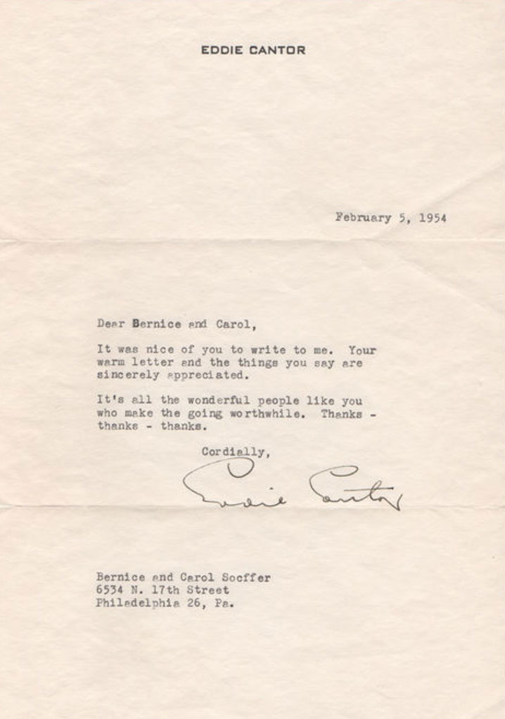 American performer, comedian, dancer, singer, actor and composer with a career that encompassed Broadway, radio, movies and the early days of television. His nickname was "Banjo Eyes" for the eye rolling he did during his song and dance routines. Typewritten letter, dated February 5, 1954, thanking two fans for their recent warm letter. He "Thanks-thanks-thanks" them and signs it "Eddie Cantor."
