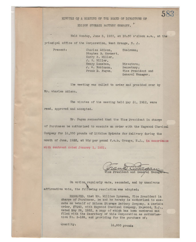 Minutes of a Meeting of the Board of Directors of Edison Storage Battery Company," dated June 5, 1922. Presided over by Mr. Charles Edison, the board authorized the purchase of 16,000 pounds of lithium hydrate. Additional issues discussed were the annual renewal of memberships for in two organizations: Chicago Association of Commerce and the Electric Power Club.