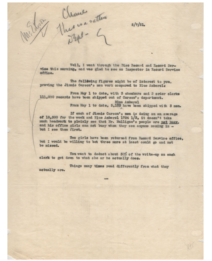 This typewritten note, dated May 7, 1921, was composed by Charles Edison, son of Thomas Edison, to his father. It discusses the inefficiency of the Blue Amberol division of Edison's company. The content specifically compares employee Jimmie Carson and his team to the team working on Blue Amberol. Charles determines that the Blue Amberol division is not working to its full potential and suggests that the team manages to make itself look busy when necessary. Thomas Edison has written a personal note at the top, "Charles. This is a rotten dept." and includes his prominent initial, "E."