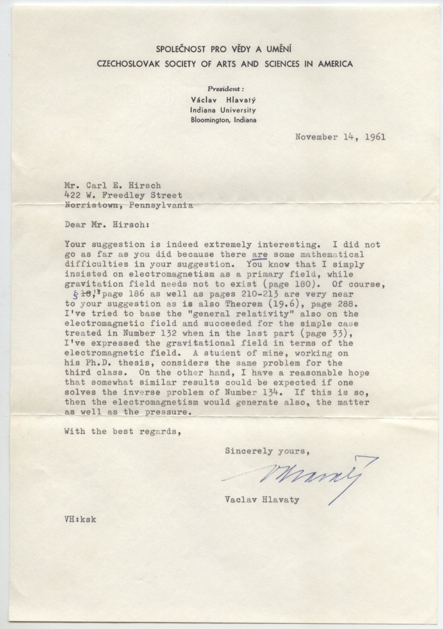 He wrote extensively about Einstein's Theory of Relatively, and corresponded with Einstein on the subject for many years. Among his notable achievements were solving of several difficult and critical equations related to Einstein's Unified Field Theory. Typed letter on Hlavaty's stationery as president of the Czechoslovak Society of Arts and Sciences in America, dated November 14, 1961, concerning a detailed reply to certain questions relating to relativity, mathematics, and electromagnetic and gravitational fields. Signed by Hlavaty in blue ink.