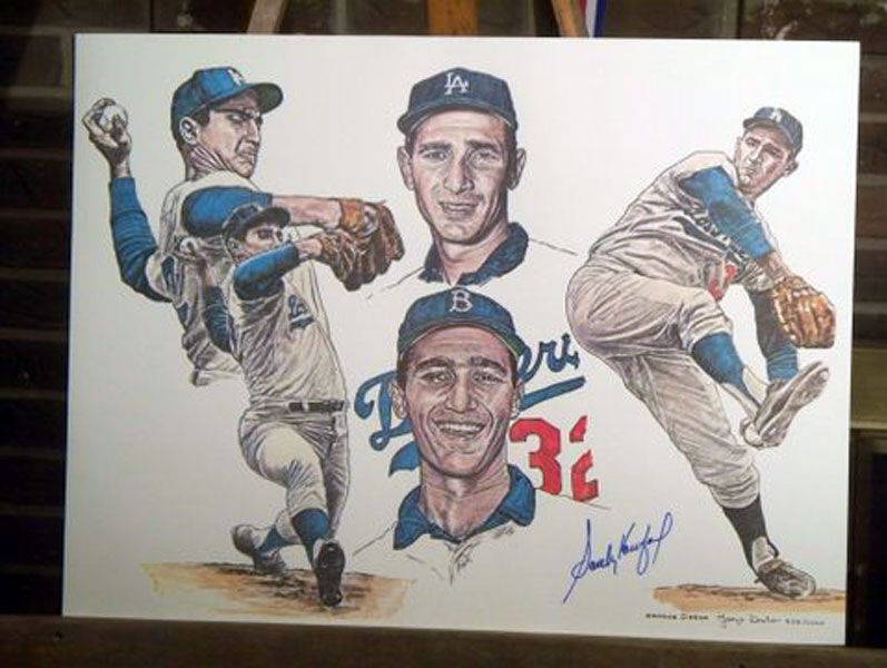Baseball pitcher for the Brooklyn/Los Angeles Dodgers, Baseball Hall of Fame and winner of 3 Cy Young Awards in 1963, 1965 and 1966. Koufax was the first major league player to pitch four no-hitters (including the eighth perfect game in the history of baseball.) A limited edition print (18" x 24") boldly autograph signed by Koufax.