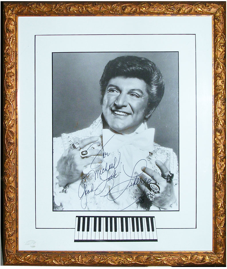 A world-renowned pianist with a career that spanned four decades and covered concerts, recordings, film and television, Liberace became the highest paid entertainer during the 1950s, 1960s and 1970s. A child prodigy born to a musical family, Liberace was a showman. He became a star in the '50s, both through his records and assorted television and film appearances. His appearance and repertoire were became increasingly campy, dressing himself in rhinestones, gold lame, furs, and sequins while playing everything from Gershwin and show tunes to lounge jazz and light classical pieces. With a lighted candelabra placed on his piano. Liberace's star rose rapidly in the early '50s, and he had his own syndicated television show, appropriately titled "The Liberace Show." His celebrity reached a peak in the mid-'50s starring in the 1955 film "Sincerely Yours," a movie about a deaf concert pianist, was mentioned in popular song, "Mr. Sandman" by the Chordettes and published his own cookbook. In 1956, Liberace celebrated 25 years in show business with an extravagant concert at the Hollywood Bowl. Liberace would go on to make appearances on other television programs like "The Ed Sullivan Show, "Person to Person," "The Jack Benny Program," "The Tonight Show with Jack Paar," "Here's Lucy," "The Monkees" and "Batman" among others. The success of Liberace's syndicated television show drove record sales. By 1954, he had recorded nearly 70 albums with his record "Liberace by Candlelight" selling over 400,000 copies. This museum quality framed photograph of Liberace measures 13" x 15". The white mat showcases a beautifully cut piano keyboard within the matting at the bottom. The photograph features a personal note reading "To Michael Good Luck, Liberace."
