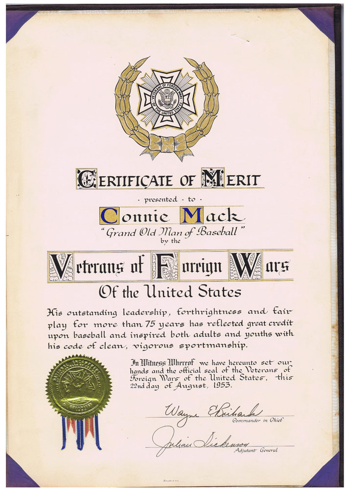 American baseball player, manager and team owner and the longest-serving manager in major league baseball history. He played baseball from 1886 to 1896 before becoming manager of the Milwaukee Brewers. He would go on to manage the Philadelphia Athletics for the club's first 50 seasons. He was the first manager to win the World Series three times and the only manager to win consecutive Series on separate occassions (1910-11, 1929-30). Fifty years as a big league manager earned Mack the records for most games managed, most games won, and (of course) most games lost. He finished that amazing career with 3,776 wins, 4,025 losses, and a winning percentage of 0.479. He was elected to the Baseball Hall of Fame in 1937. Born Cornelius McGillicuddy, Mack legally changed his name at the turn of the century so it would fit easier onto ballpark scoreboards. This Certificate of Merit, dated August 22, 1953, was presented to Connie Mack "Grand Old Man of Baseball" by the Veterans of Foreign Wars of the United States. The document was awarded to Mack for "his outstanding leadership, forthrightness and fair play for more than 75 years has reflected great credit upon baseball and inspired both adults and youths with his code of clean, vigorous sportsmanship." It is signed by Wayne E. Richards, Commander in Chief and Julian Dickenson, Adjutant General. The Certificate was presented to Mack in a presentation portfolio with his name inscribed in gold leaf.