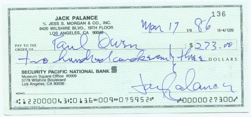 American movie actor, bomber pilot during World War Two, won an Academy Word for his role in "City Slickers." Personal check drawn on the Security Pacific National Bank for $273.00, dated March 17, 1986. Filled out in Palance's hand and signed "Jack Palance."