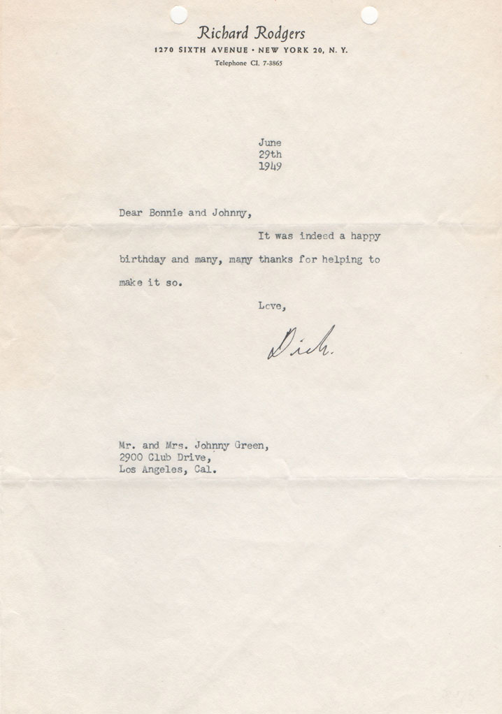 Richard Rodgers was a famous American composer of more than 900 songs and over 40 Broadway musicals such as The Sound of Music, South Pacific, Oklahoma, The King and I and many more. He was the first person to win an Emmy, a Grammy, an Oscar and a Tony. Typewritten and signed letter on Rodgers' personal stationary to songwriter, Johnny Green. Signed affectionately, "Dick."