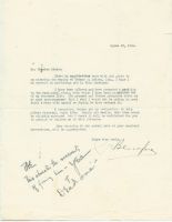 Invented the phonograph, developed the electric light bulb and the motion picture projector. Typed letter of resignation from an employee of Thomas A. Edison Inc., dated August 27, 1924, addressed to Charles Edison. Charles has commented and forwarded the letter to his father, writing "T.A.E., This obviates the necessity of firing him." Thomas Edison has added below, "Yes - Dead one. E." An intriguing glimpse inside Edison's pioneer research laboratory.