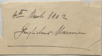 Enormously important in the field of radio, he invented the wireless and formed the first radio communication company, "Marconi's Wireless Telegraph Company." Signature on paper dated March 4, 1902. Clean separation in paper at the "n" and "i" in his last name. A nice strong, early Marconi autograph.
