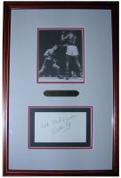 American professional boxer who boxed a total of 1956 rounds in the 241 bouts of his 26 year career. His final record was 229-11-1 with 65 fights resulting in knockouts. Pep was considered to be one of the best fighters of the 20th century and inducted into the International Boxing Hall of Fame in 1990. Museum quality frame measuring 11.5" by 17" houses two smaller frames. A photograph of Pep is on top with a signed card in Pep's hand is below. The card reads "With Best Wishes Willie Pep."