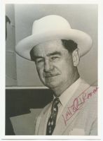 His book With Lawrence in Arabia helped propel T. E. Lawrence to fame. 5" by 7" black and white photograph of Thomas wearing a white hat and standing near the tail of an airplane. Signed in red ink, "Lowell Thomas."