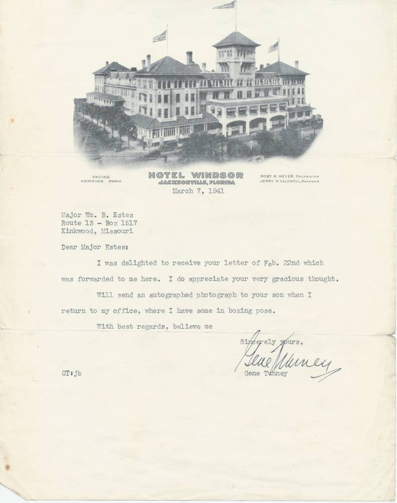 American Heavyweight Boxing Champion, won his title from Jack Dempsey in 1926. He retired undefeated. Typed letter on the stationery of the Hotel Windsor, Jacksonville, Florida, to Major William B. Estes, dated March 7, 1941. Tunney promises to send an autographed picture "in boxing pose." Signed in full, "Gene Tunney."
