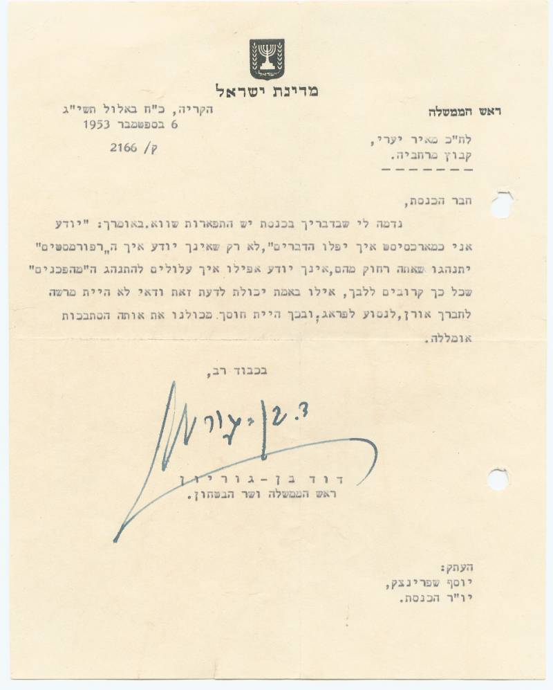 Israeli statesman, First Prime Minister of Israel, declared Israeli independence in 1948. Typed letter on official letterhead, dated September 6, 1953. In Hebrew, untranslated. Signed by Ben Gurion as Prime Minister. $890.00*