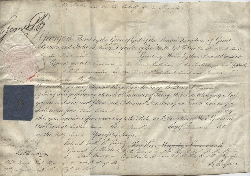 King of Great Britain, eldest son of George III. In 1811, when George III's mental instability prevented him from fulfilling his duties, George IV (then Prince of Wales) was appointed Prince Regent, ruling in his father's name. He ascended the throne as George IV upon the death of George III in 1820. Vellum commission document appointing Charles Finch as Paymaster to the 2nd Battalion of the 12th East Suffolk Regiment, dated February 13, 1812, during the Napoleonic Wars. Signed "George PR" as Prince Regent. Set with two wax and paper seals. $425.00*
