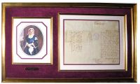 Monarch of the United Kingdom of Great Britain and Ireland from 1837 until her death. Her reign of 63 years and 7 months is the longest of any British monarch and the longest of any female monarch in history. Museum quality framed letter is written and signed by Queen Victoria at Buckingham Palace during the fourth year of her reign. The document measures 19" by 16" within a full 38" by 23" frame. An image of Queen Victoria is inner framed to the left of the document. The letter, dated April 2, 1841, announces C. D. Day, Esq. as Executive Council of the Province of Canada. The letter bears the official seal of the Queen and is addressed to the "Right Trusty and well-beloved Councillor Charles Baron Lydenham Our Captain General and Governor in Chief in and over Our Province of Canada." $2500*