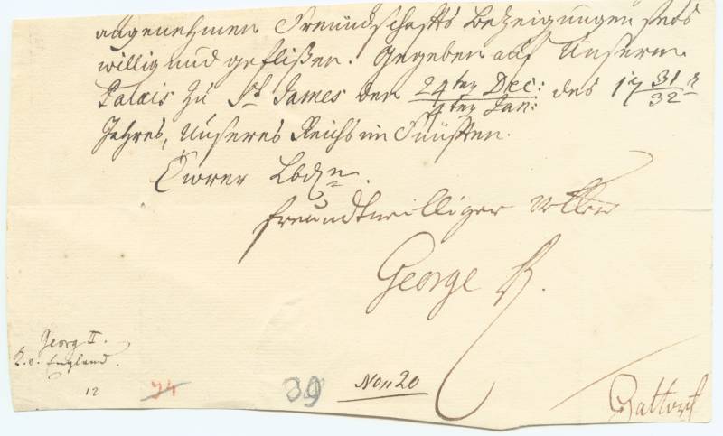King of Great Britain, only son of George I. At odds with his father most of his adult life, including establishing a rival court of his own in 1718. Reconciled with George I through the mediation of Prime Minister Walpole in 1720. Ascended to the throne upon his father's death in 1727. Portion of a larger document, in German, dated 1738, and signed "George R" as king. $485.00*
